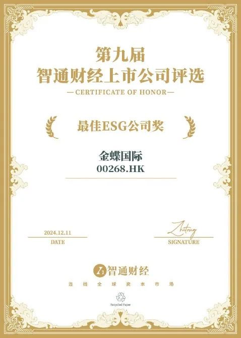 此外,金蝶在 “第九届智通财经资本市场年会暨上市公司颁奖典礼” 上荣获 “最佳 ESG 公司奖”。这一盛会由智通财经与新智基金网联合主办,进一步肯定了金蝶在 ESG 领域的领导地位。