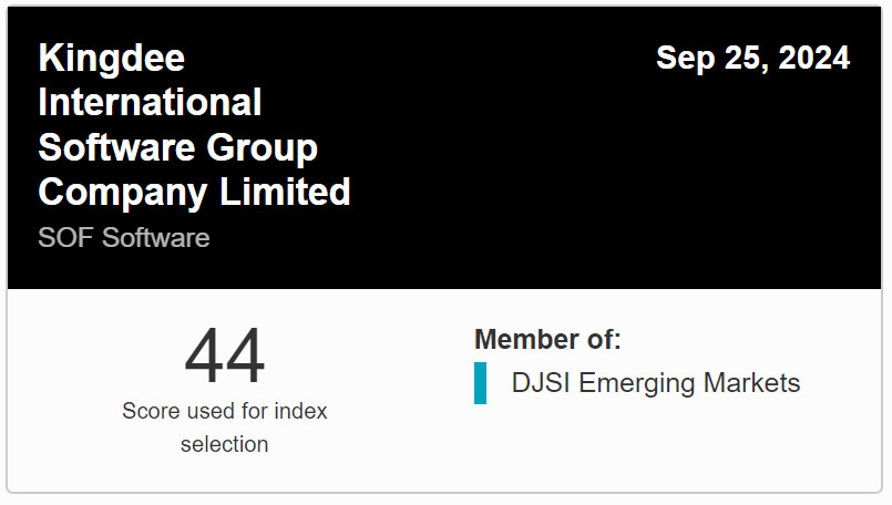 近日,金蝶国际软件集团有限公司(0268.HK,以下简称“金蝶”)入选道琼斯可持续发展新兴市场指数(DJSI Emerging Markets),且是唯一入选的中国软件企业!这一成就标志着金蝶在企业可持续发展领域的卓越表现和全球认可。