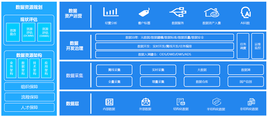 数据是数字经济时代的关键生产要素,高水平的数据管理能力是现代企业提升运营效率、优化客户体验、创新服务模式、构筑核心竞争力的基石。金蝶获得DCMM量化管理级认证并非偶然,而是基于其多年来在数据治理领域的深耕与实践积累。金蝶AI苍穹数据治理体系以“四横一纵”为核心架构,以企业数据资源规划(一纵)为核心,全面评估数据现状,确立数据资源架构,确保数据资产的有效管理。在数据治理具体执行层面,通过数据层、数据采集、数据开发治理及数据资产运营(四横)四个方面,构建企业数据资产存、通、治、用的全流程管理体系。